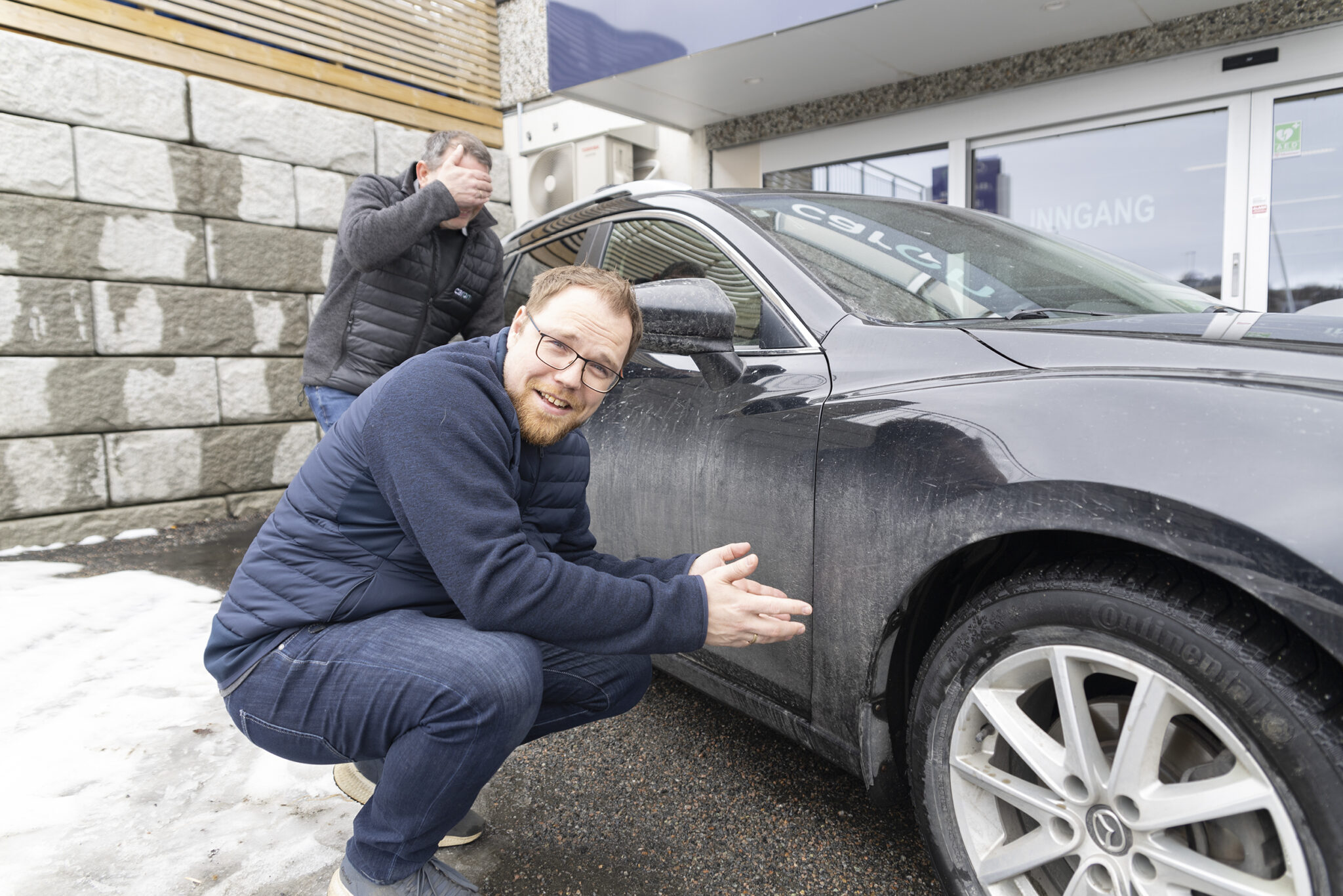 – Kjenner du med hånda på bilen og kjenner de små kornene i lakken, så har du en bil som trenger omsorg. Da er det aller beste du kan gjøre å finne fram høytrykkspyler og sette av tid for å vaske bilen, sier Marius.